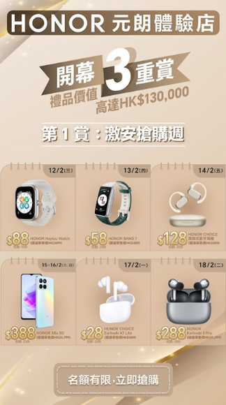 HONOR第二間香港體驗店日前於元朗形點二期(YOHO MALL II)開幕,為回饋用戶支持,由即日起至2月28日推出元朗體驗店「新春開幕三重賞」,多款智能產品每日以優惠價發售,例如顧客可以HK$1超值價購買HONOR CHOICE Earbuds X5藍牙耳機(建議零售價為HK$269),限量85隻。其他優惠詳情如下: